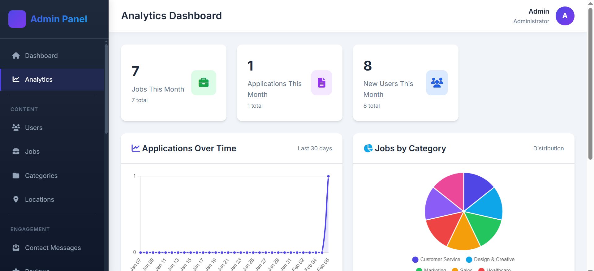 - Analytics & Reporting: activity logs, user/job/application reports with export options