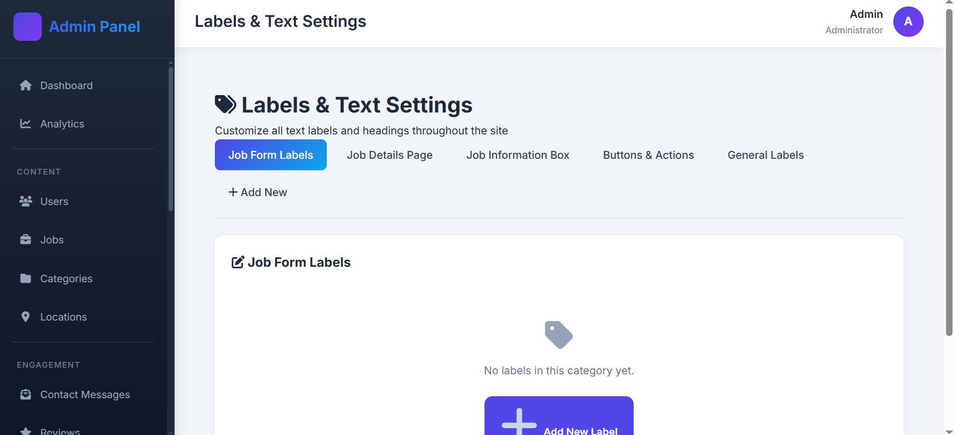 - Content management: categories, locations, pages, labels