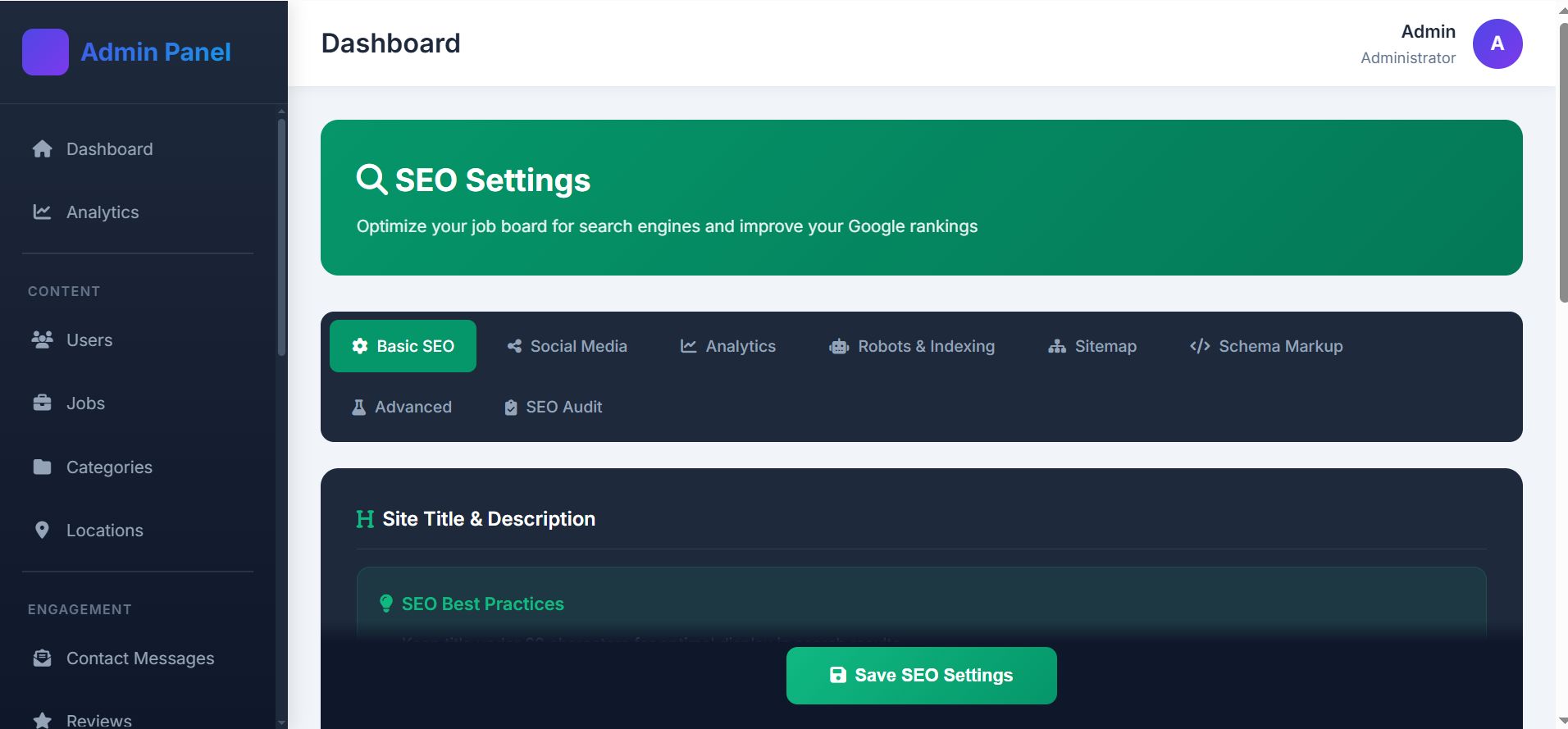 The platform features a powerful Admin Panel giving full control over users, jobs, content, SEO settings, email notifications, newsletters, career tools, and certificate management. JobBoard Pro supports SEO-friendly URLs, dynamic meta tags, Open Graph and Twitter Cards, Google Analytics, and responsive design for mobile, tablet, and desktop.