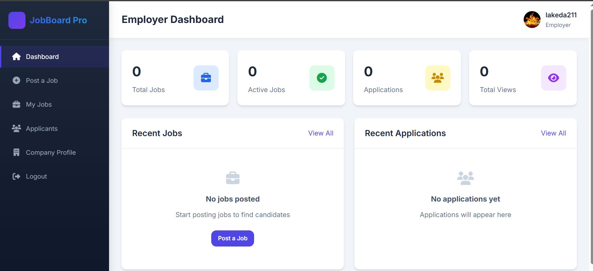 - Employer: post/manage jobs, track applications, company profile management