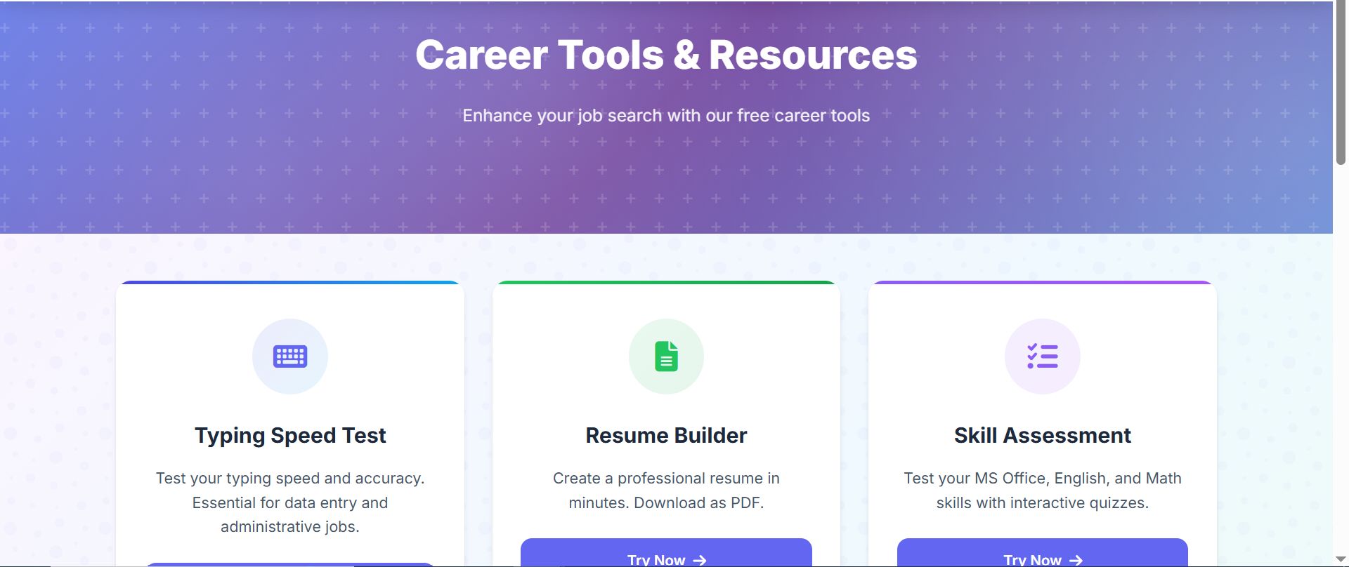 Candidates can search and apply for jobs, save favorites, track application status, build resumes using the interactive Resume Builder, take Typing Speed Tests, Skill Quizzes, and Career Aptitude Quizzes, and earn verified certificates with QR code verification. Employers can post and manage jobs, track applicants, update statuses, manage company profiles, and access detailed job analytics.