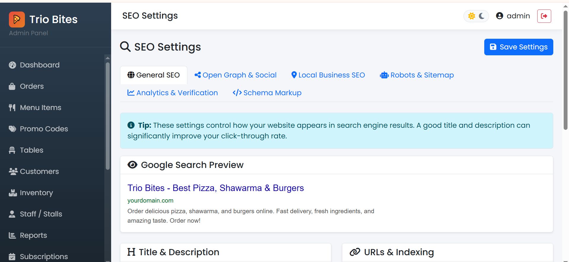 Trio Bites includes a powerful and easy-to-use admin panel that allows restaurant owners to manage orders, menu items, categories, staff, inventory, customers, discounts, and website content without any technical knowledge. All business operations can be controlled from a single dashboard, helping owners save time and improve efficiency.