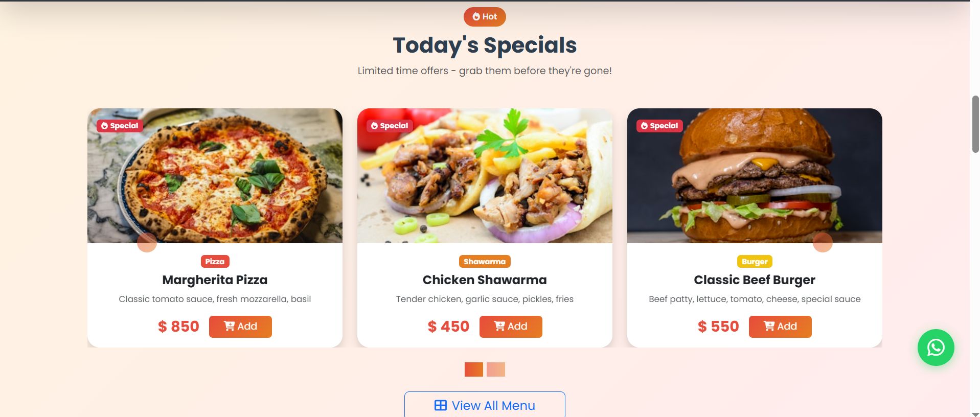 The platform supports multiple payment methods such as Cash on Delivery, Easypaisa, JazzCash, Bank Transfer, Stripe, and PayPal. It also features QR code table ordering for dine-in customers and WhatsApp integration for instant customer communication and order notifications.