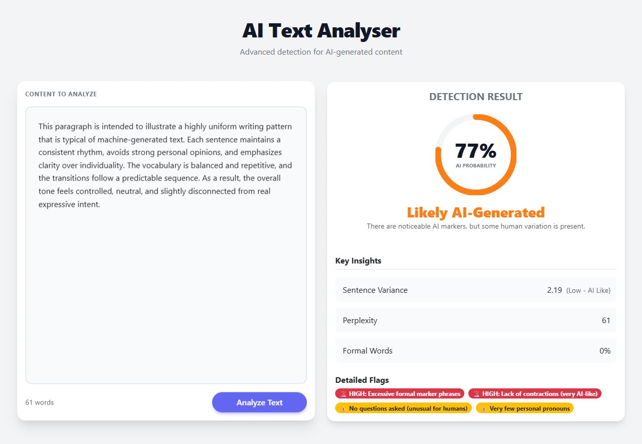 This tool also provides useful text metrics such as word count, character count, and sentence count. It is lightweight, easy to use, and ideal for educators, bloggers, content reviewers, and anyone interested in evaluating content authenticity.