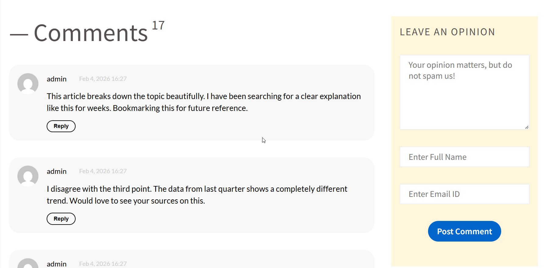 The theme ships with 16 purpose-built custom blocks that cover every section of a modern content site. These include an Editor Picks carousel with hand-picked post selection and arrow navigation, a Trending sidebar that ranks posts by comment count or displays them randomly, a Recent Posts grid with AJAX-powered search and Load More pagination, an Author Box that pulls data dynamically from WordPress user profiles with support for 7 social platforms (X, Facebook, Instagram, LinkedIn, YouTube, GitHub, Pinterest), a fully functional comment system with threaded replies and honeypot spam protection, post navigation with previous/next and random post buttons, a Subscribe Form compatible with any ESP (Mailchimp, ConvertKit, AWeber) via configurable action URL, and category browsing with animated expand/collapse.