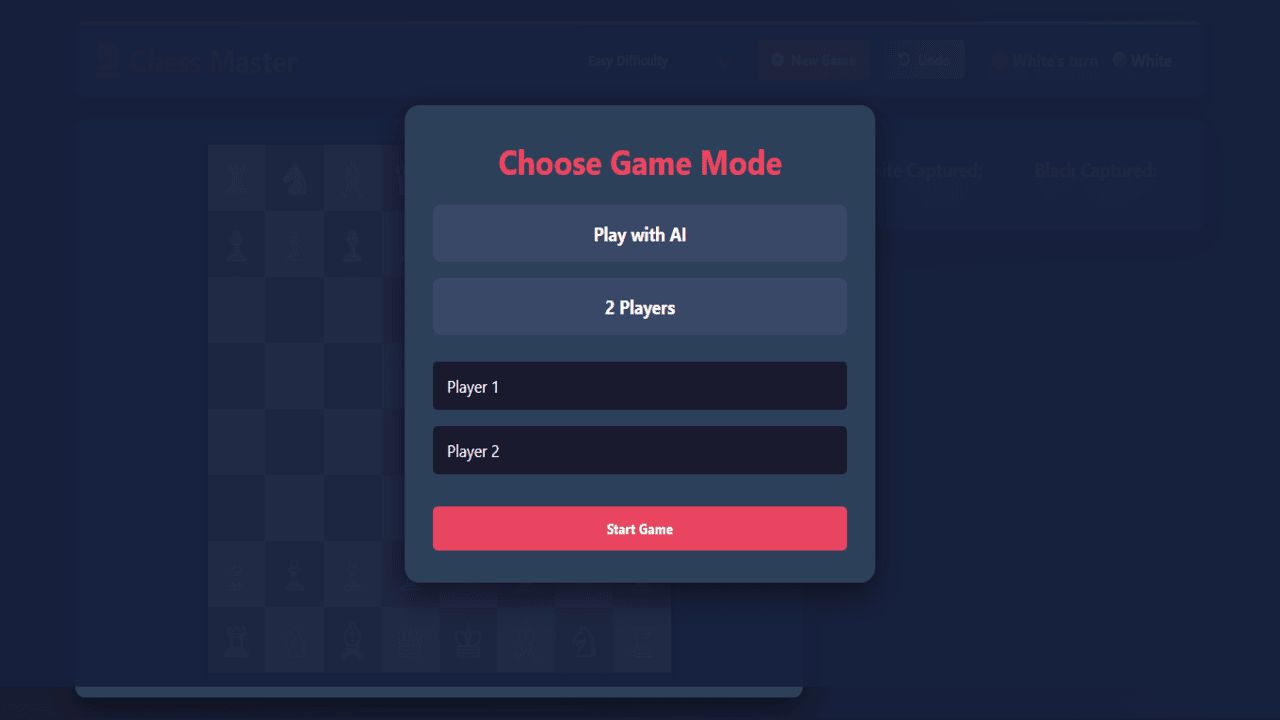 A browser-based chess game with AI/human opponents, admin/player dashboards, user accounts, and game tracking.Chess Game with Admin Dashboard