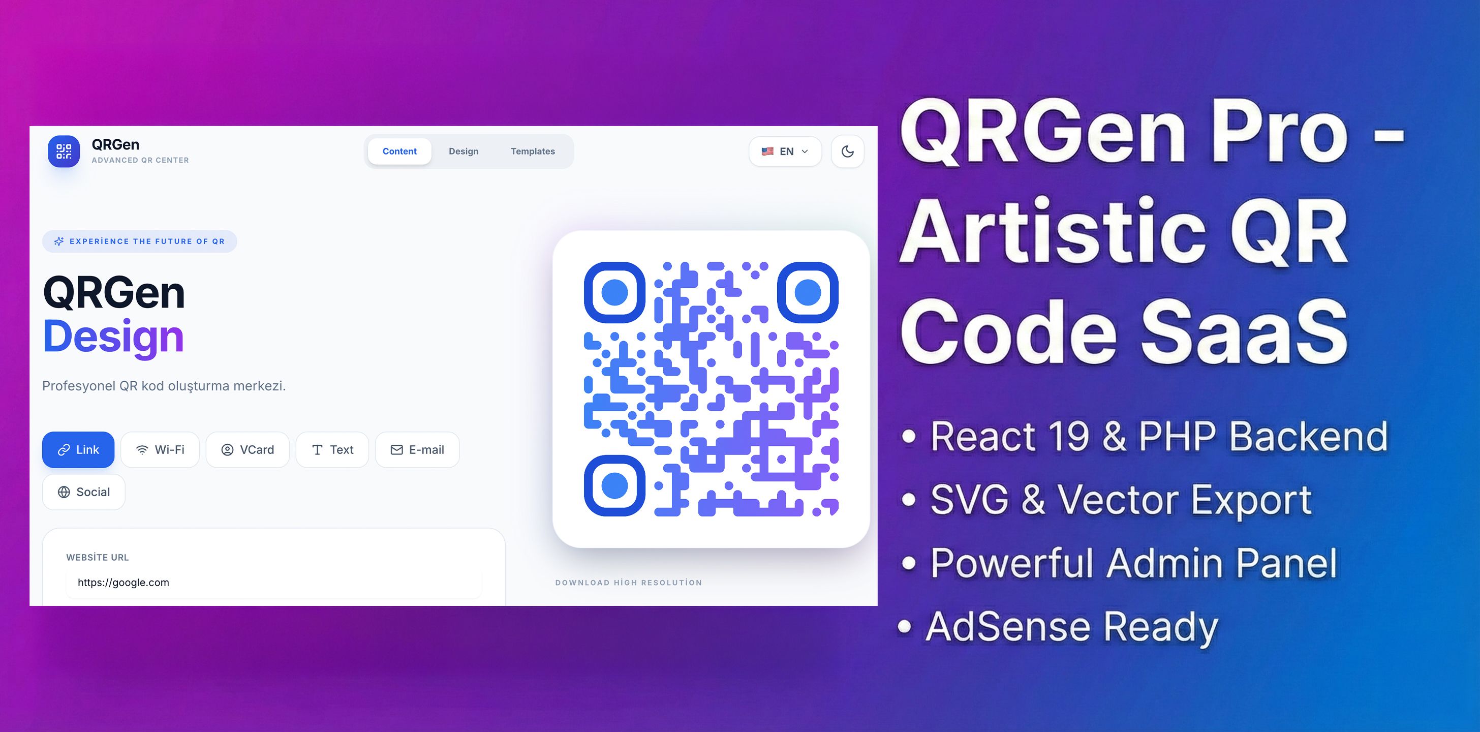 | Tags | QR generator, php script, admin panel, typescript, qr code, SaaS, tailwind css, marketing tool, dynamic qr, adsense ready, react 19, custom qr, vector qr, svg export, branded qr, artistic qr, qr studio |