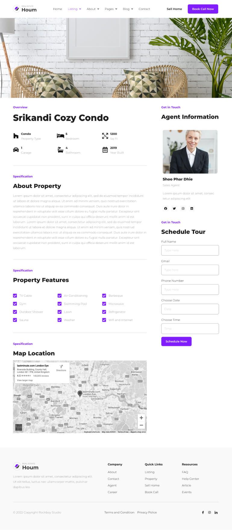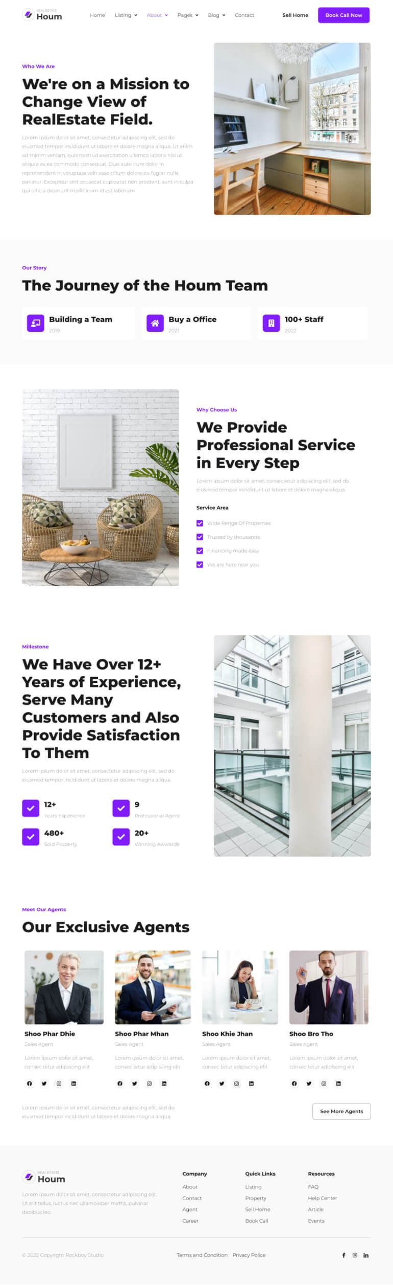 With Houm, you can build a complete real estate website in minutes. It includes all the essential pages you need, such as Property Listings, Property Details, Agent profiles, About Us, Contact, and more. The design focuses on showcasing high-quality property images and providing clear information to potential buyers or renters.