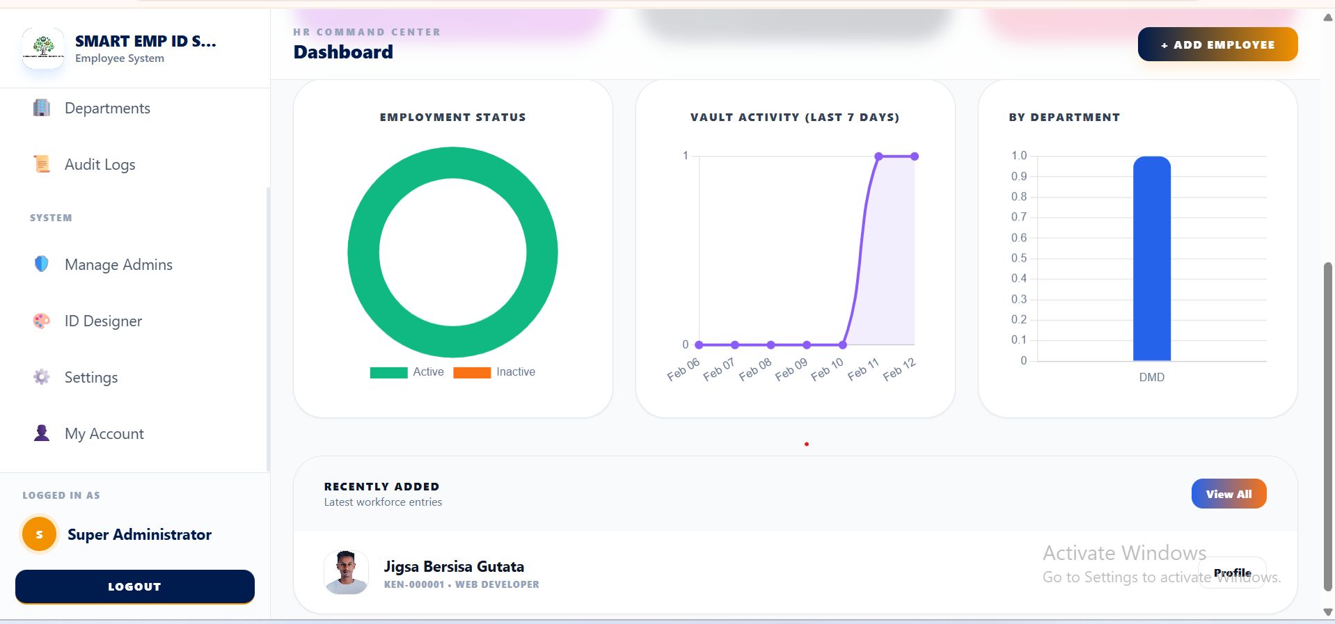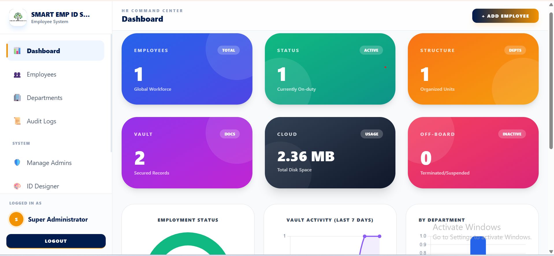- Smart Dashboard Analytics: Real-time tracking of employee status (Active/Inactive), department distribution, and total document storage usage.