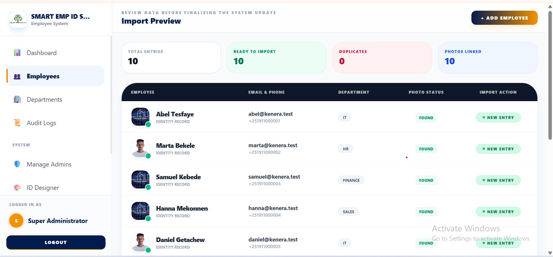 The Smart Bulk Import (Recommended): Download the Excel Template from the Import page. 2. Fill in your employee data. 3. Prepare a ZIP file containing photos named after the employee’s code (e.g., EMP001.jpg). 4. Upload both files. The system will show a Preview Table to verify data before saving.