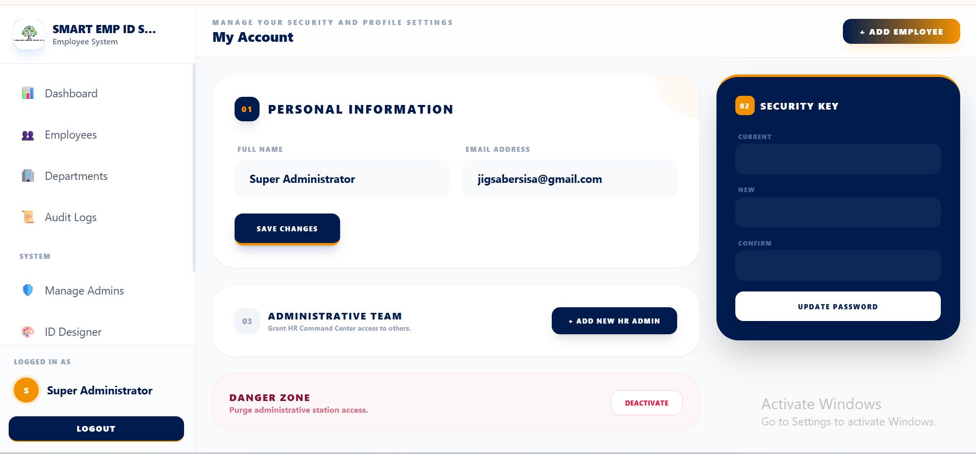 - Advanced Employee Profiles: Detailed record-keeping including emergency contacts, employment types (Contract/Full-time/Intern), and automatic ID expiry logic.