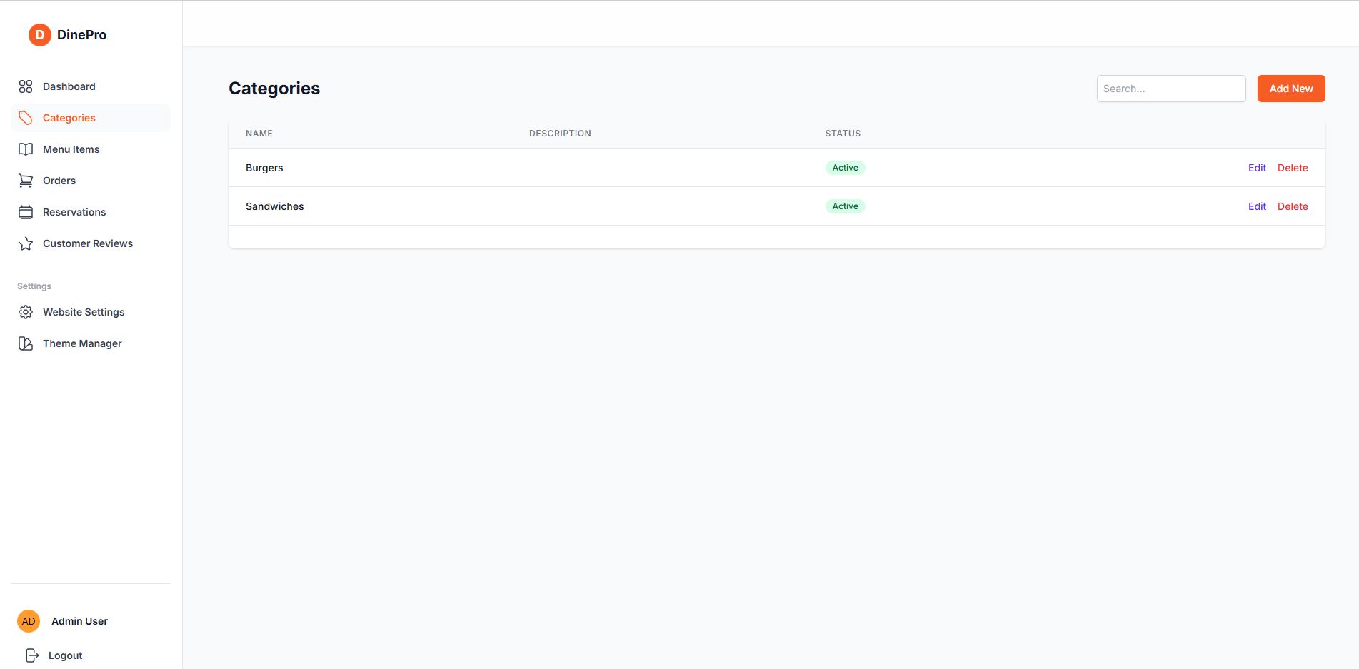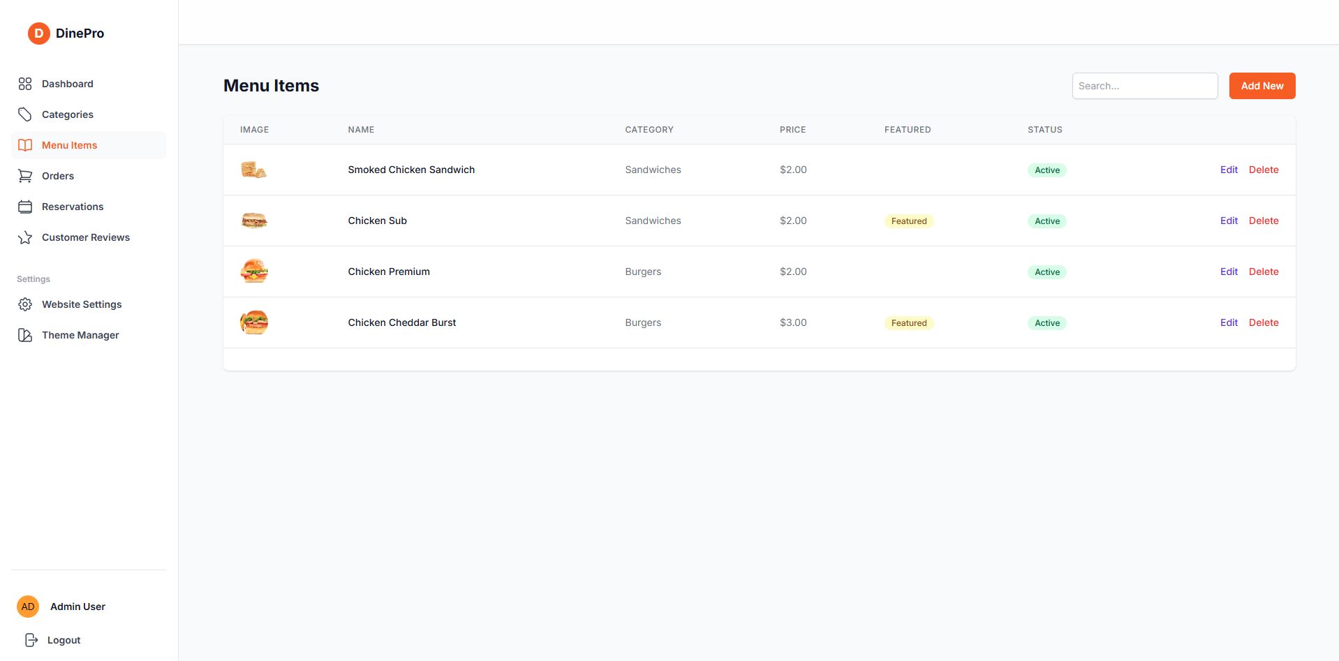 - Add, edit, delete menu items