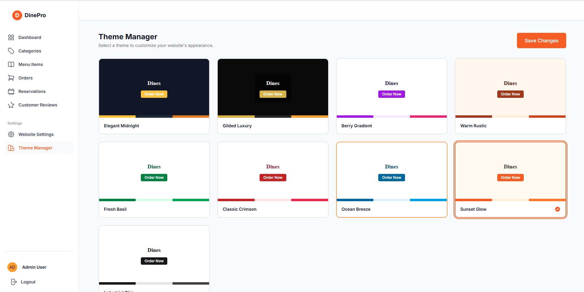 DinePro is a feature-rich restaurant management system built with Laravel. It allows restaurants to manage tables, menu items, orders, reservations, and reviews seamlessly. The system comes with a powerful admin panel, analytical dashboard, and 9 built-in website themes to quickly customize the look and feel.