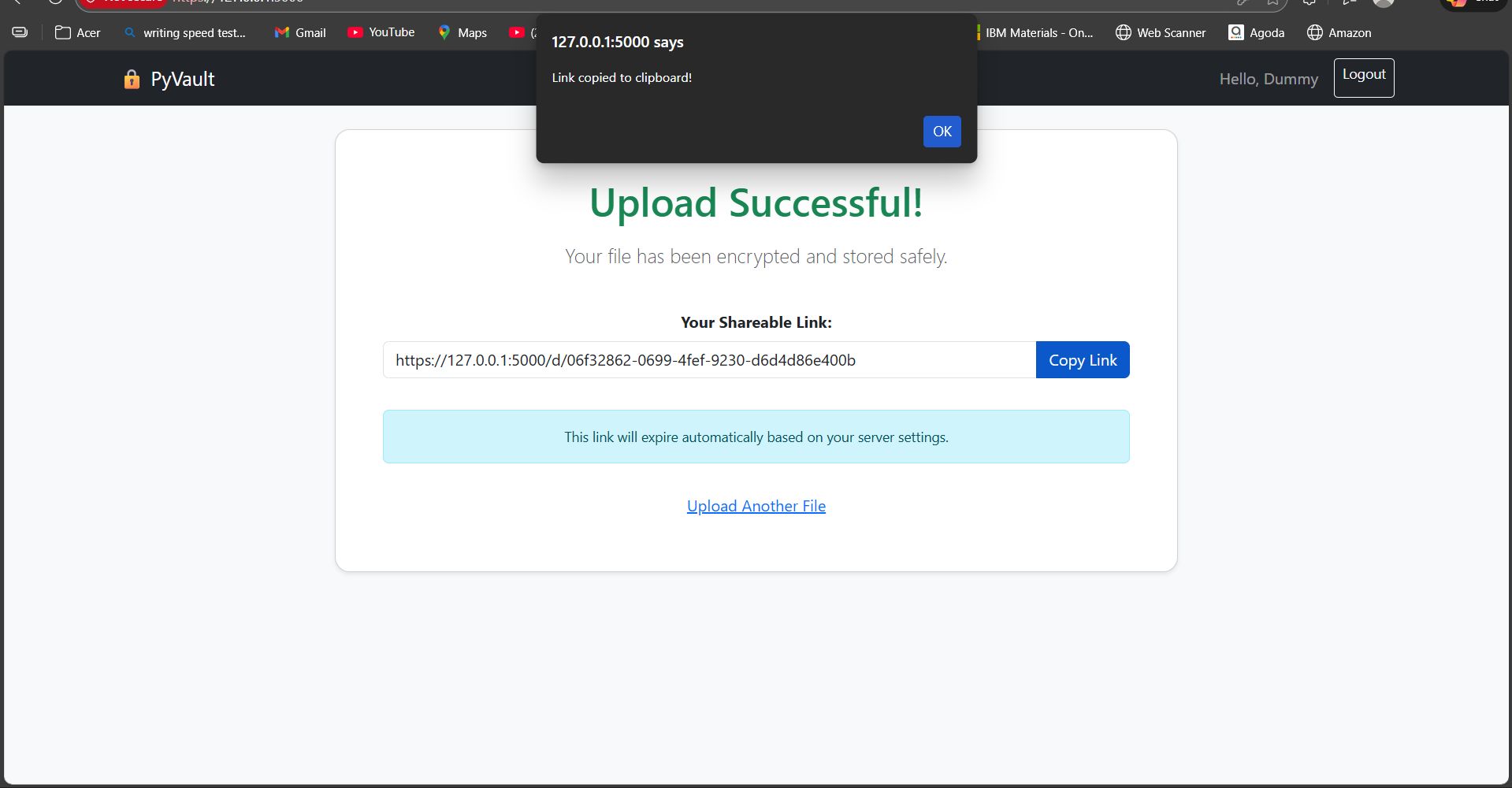Admin Dashboard: A powerful control panel to view all active files, monitor download counts, and manually delete content.Auto-Expiry System: Automatically deletes files after a set time (e.g., 24 hours) to save server space and enhance privacy.Download Tracking: Tracks how many times a file has been downloaded.Easy Installation: Runs on Python/Flask with a local SQLite database—no complex SQL server setup required.Flash Messages: Interactive notifications for success, errors, and login status.Mobile Responsive: Built with Bootstrap 5, ensuring the interface looks perfect on phones, tablets, and desktops.One-Click Copy: Simple "Copy Link" button for instant sharing.Password Protection: Users can optionally lock files with a password, ensuring only the intended recipient can access them.Secure File Uploads: Files are assigned unique, secure IDs to prevent unauthorized guessing or access.User Authentication: Complete Login and Registration system with secure password hashing.