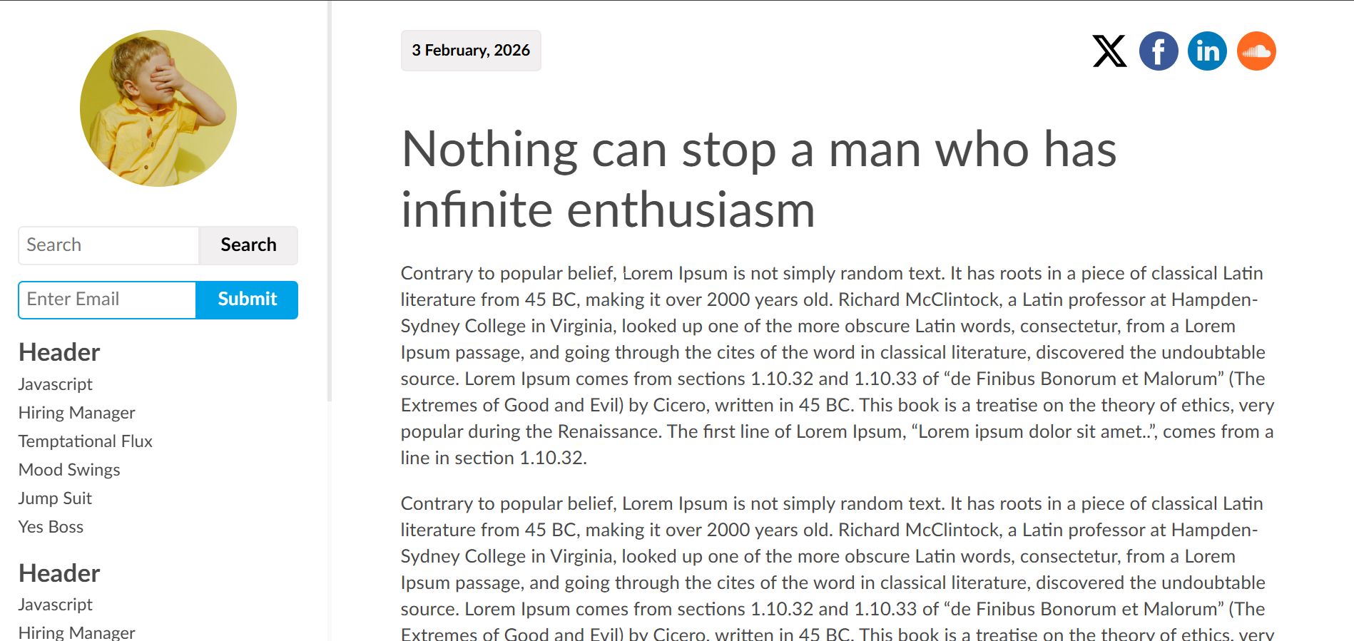 - Single Post — Individual post view with social icons, post content, tags, navigation, and comments.