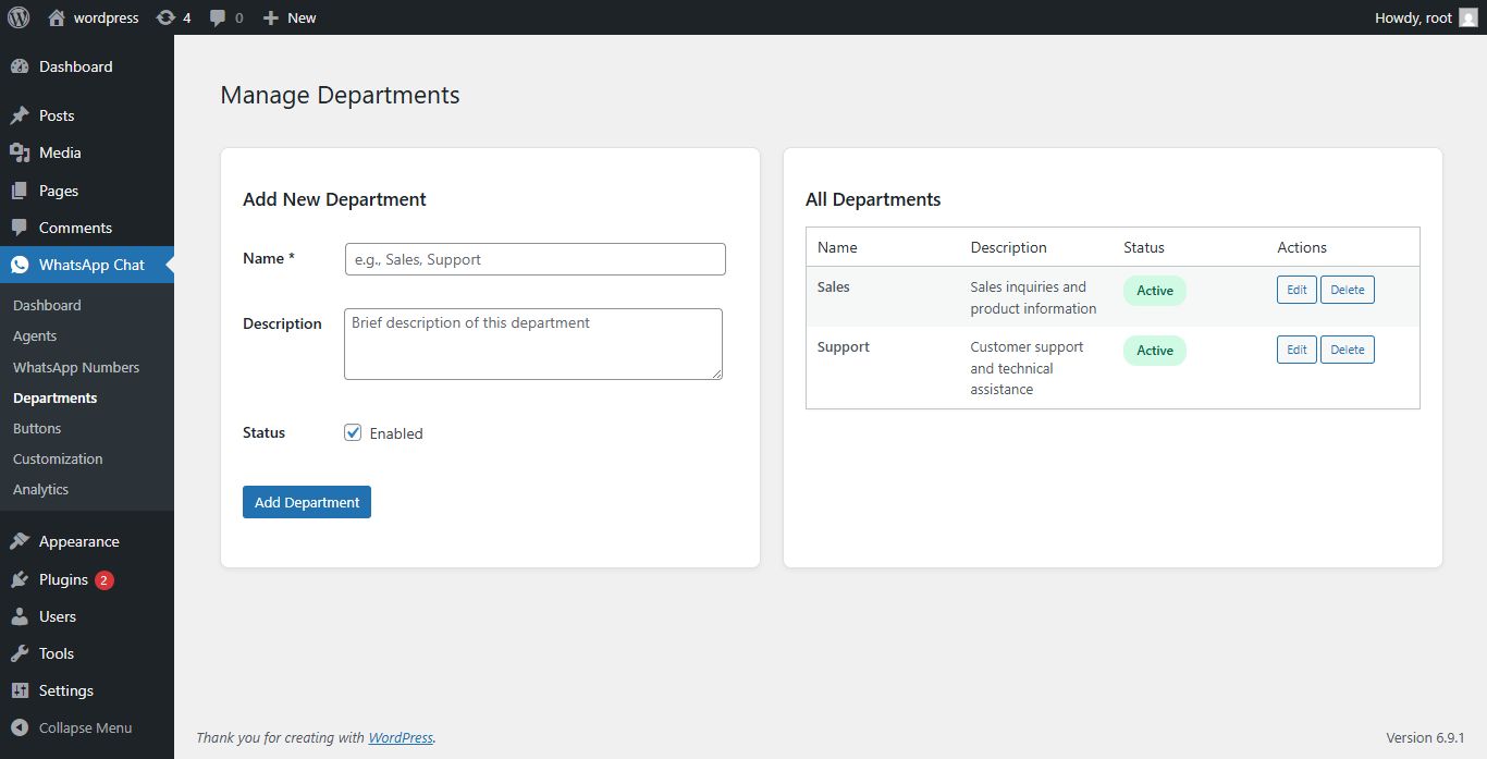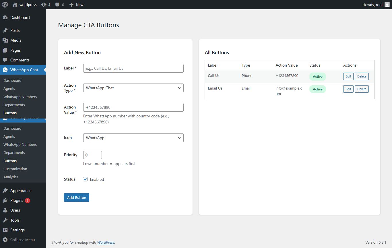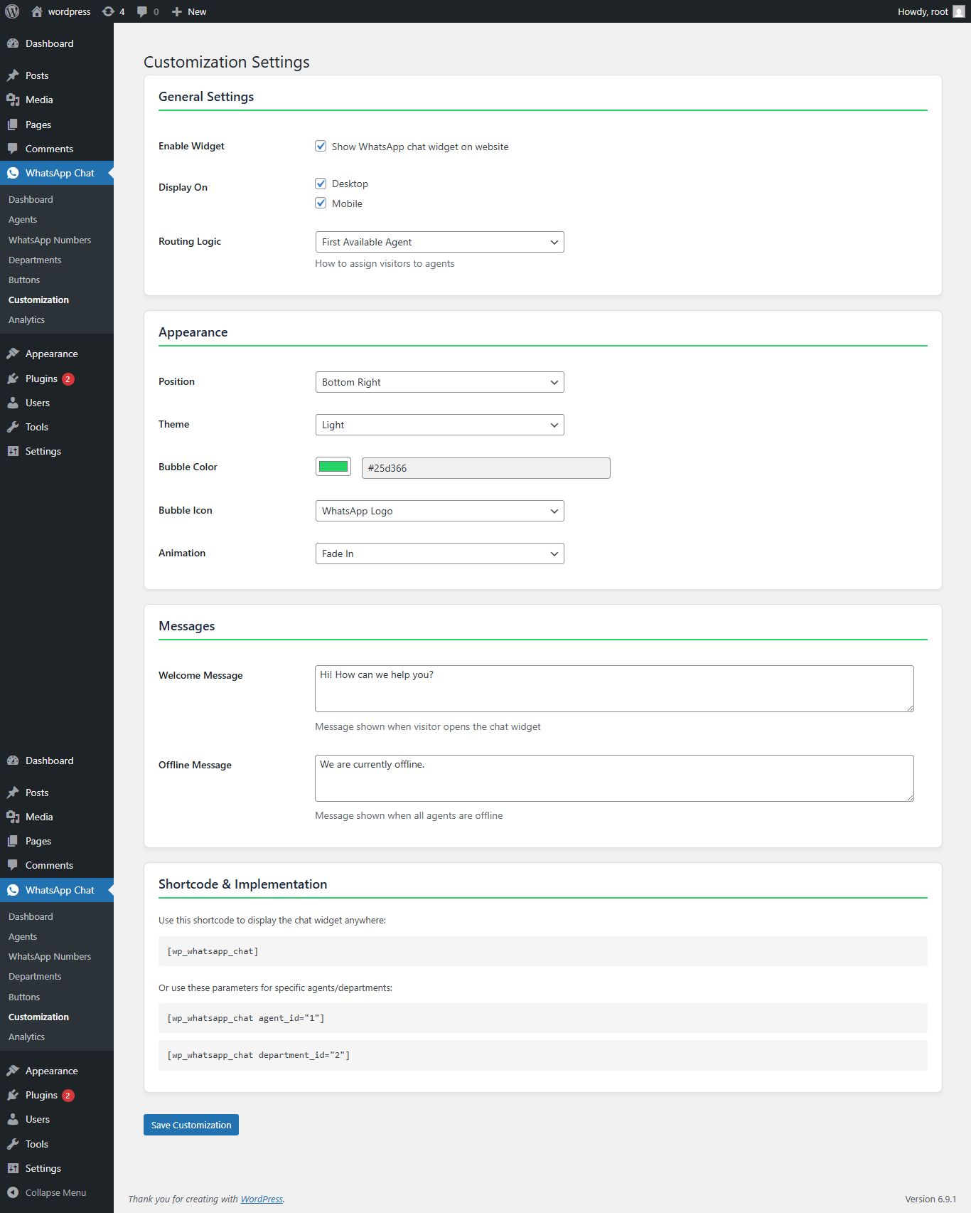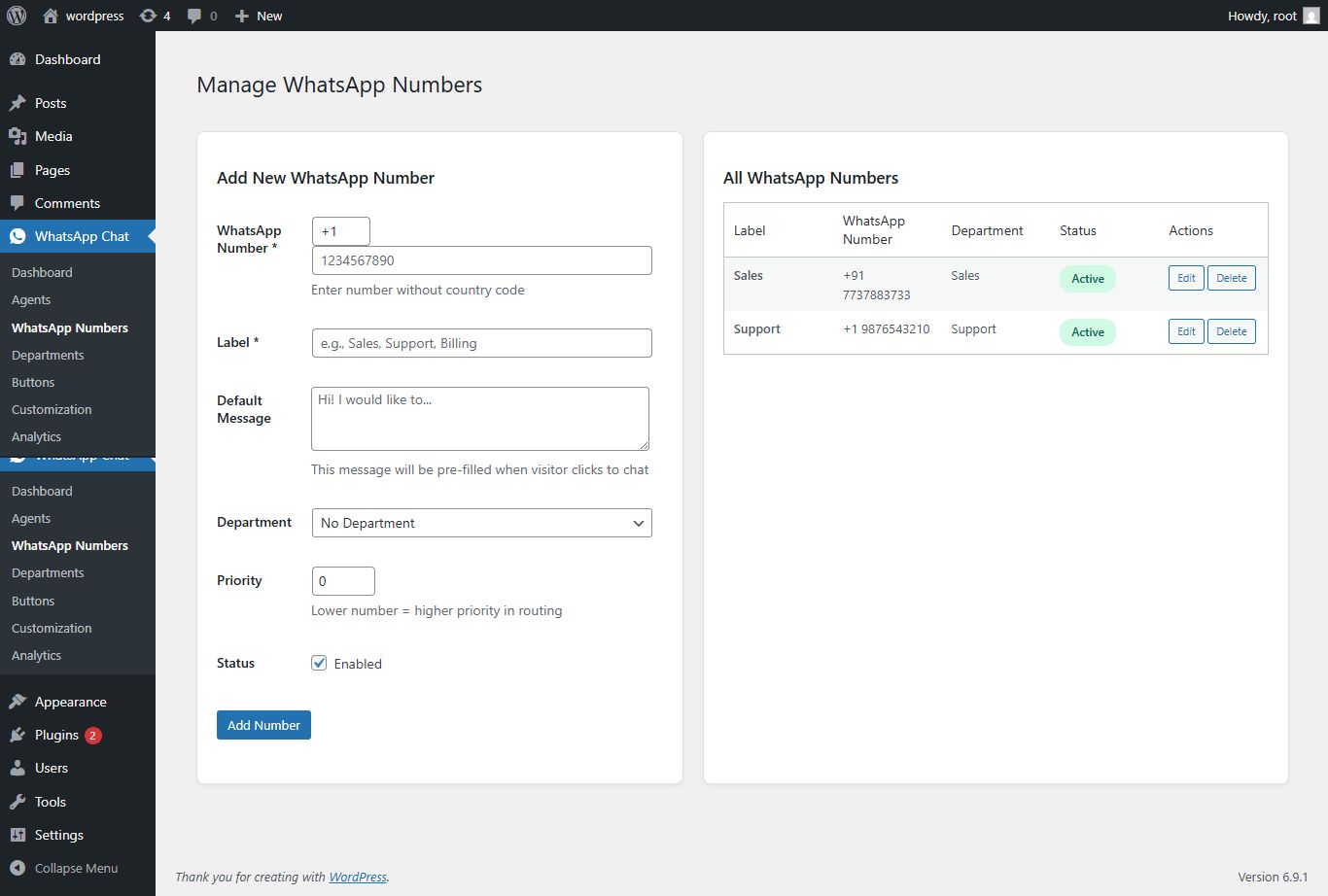 After installation, configure your WhatsApp widget by adding support agents with their phone numbers or group chat links.