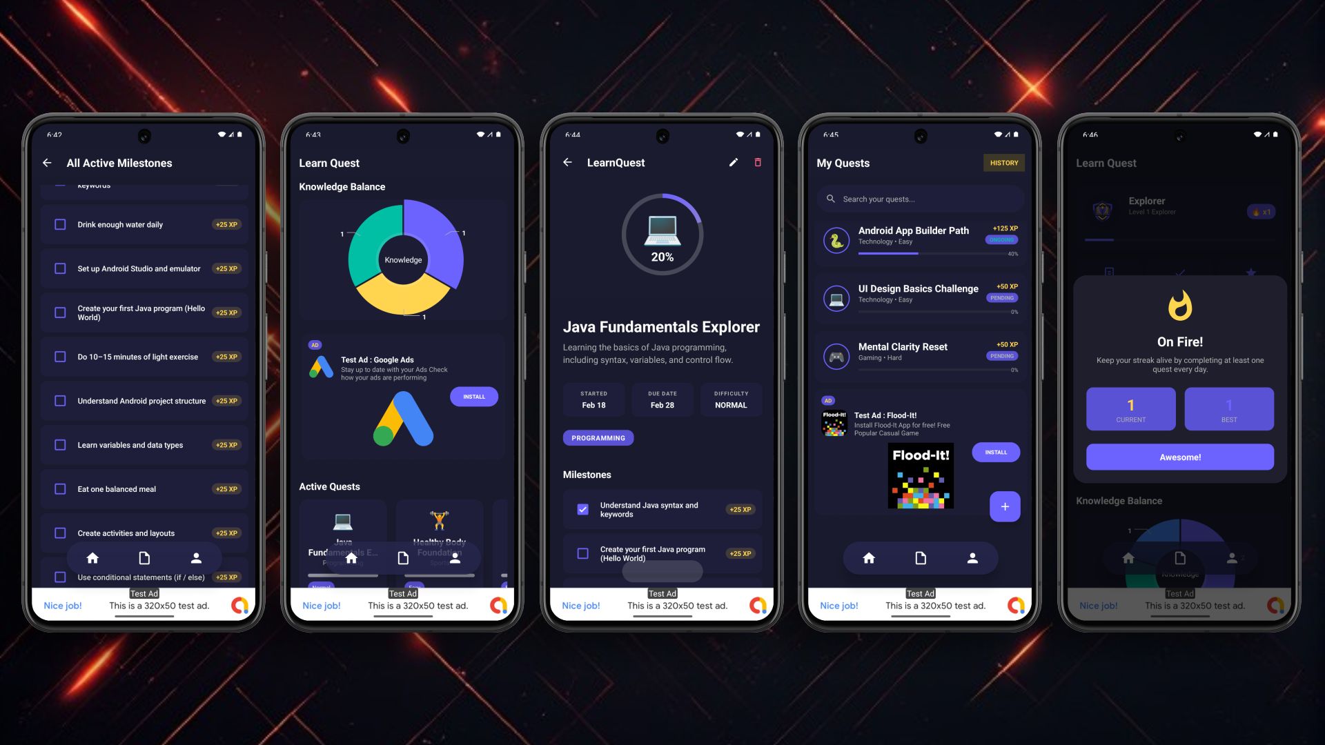 Learn Quest is a premium, high-quality Android application template that transforms mundane task management into an exciting RPG adventure. Users don't just complete habits; they gain XP, level up, maintain streaks, and unlock achievements.