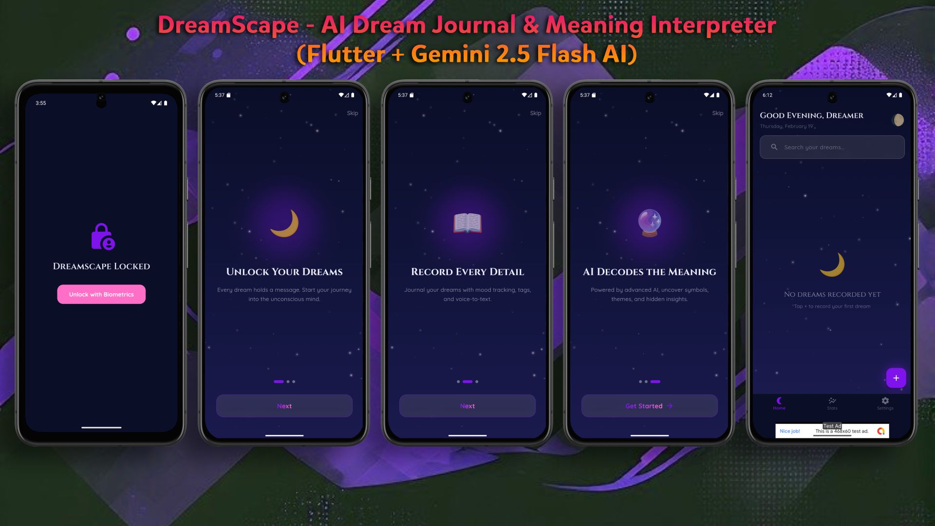 DreamScape is a premium, AI-powered dream journaling application built with the latest Flutter technology. It empowers users to record their dreams, track their moods, and receive instant, personalized interpretations powered by Google's advanced Gemini 2.5 Flash AI.
