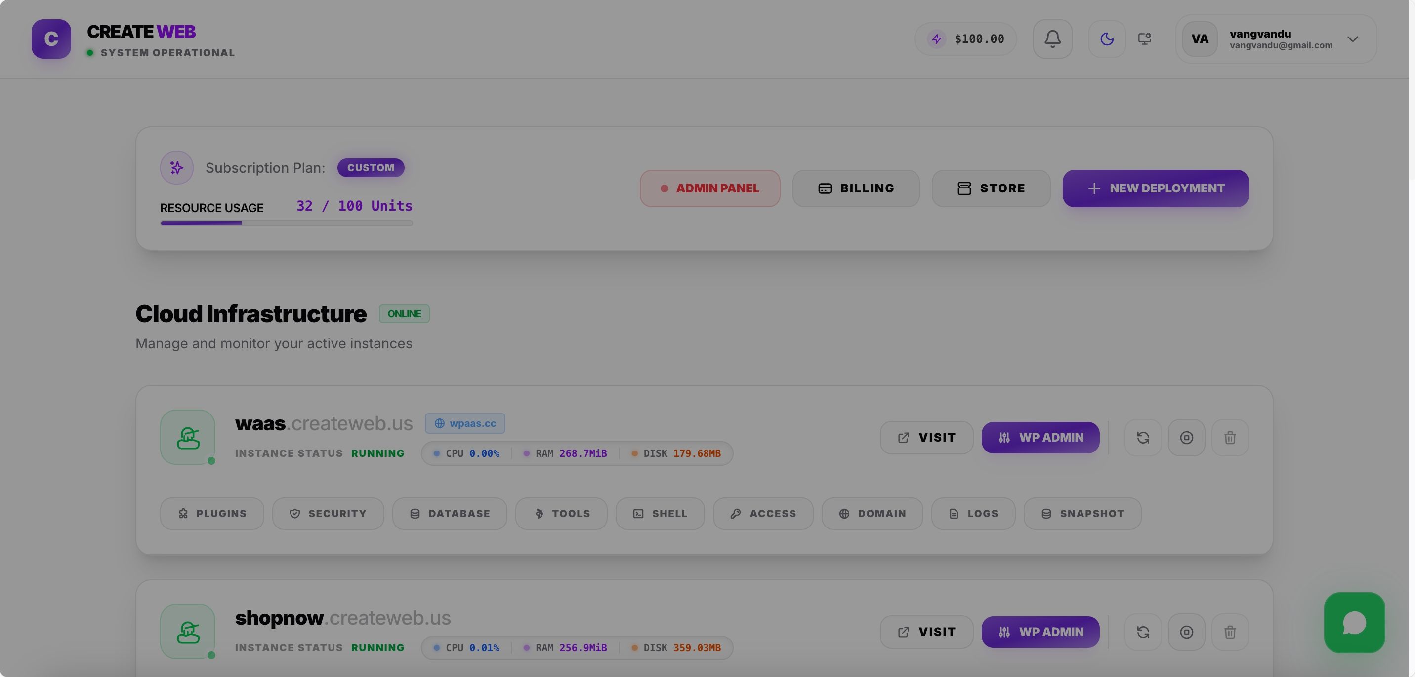 | 📊 Real-Time Dashboard | Live CPU, RAM, and storage monitoring for each WordPress instance with auto-refresh |