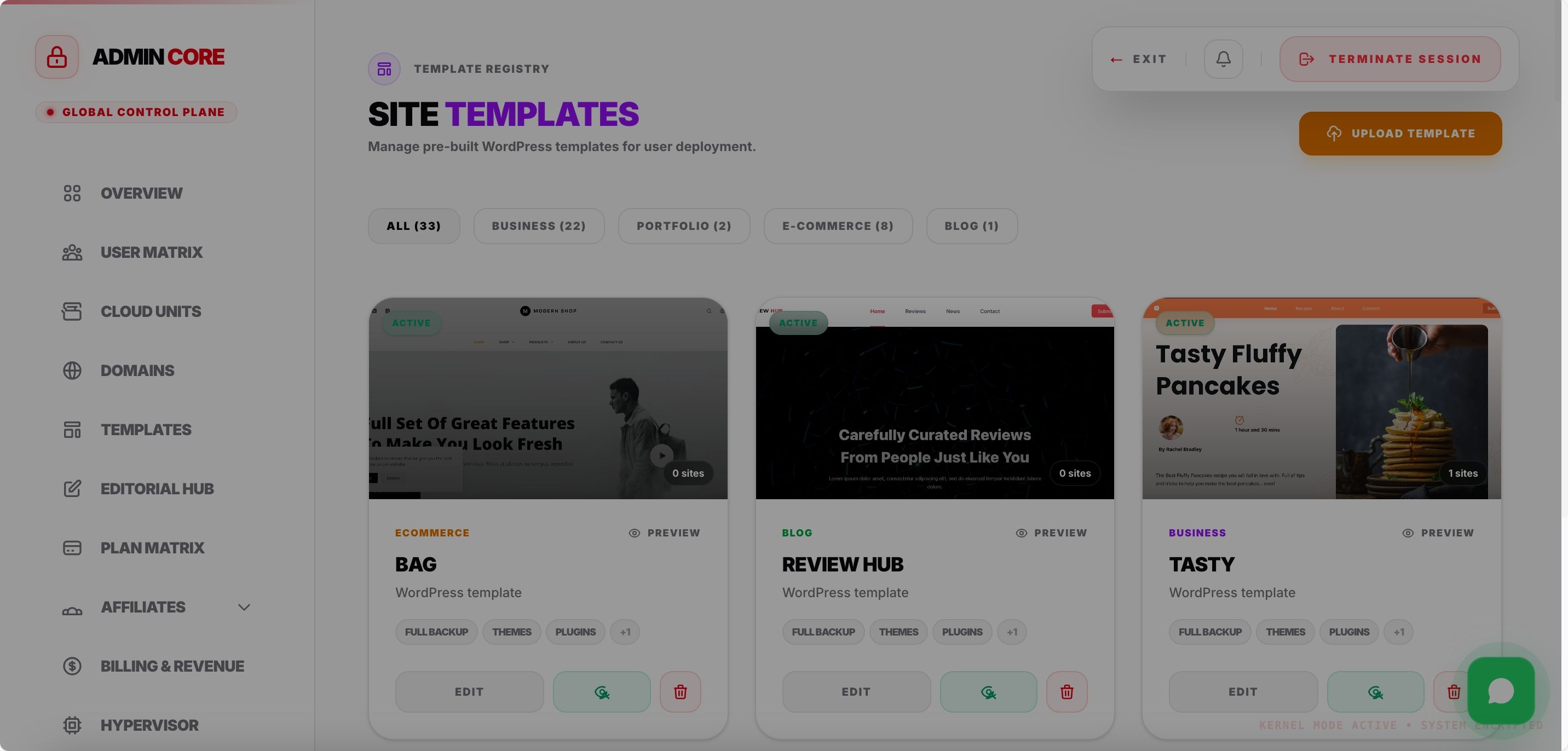 | 🎨 Template Management | Upload, edit, organize, and price templates. Save running sites as templates for rapid cloning |