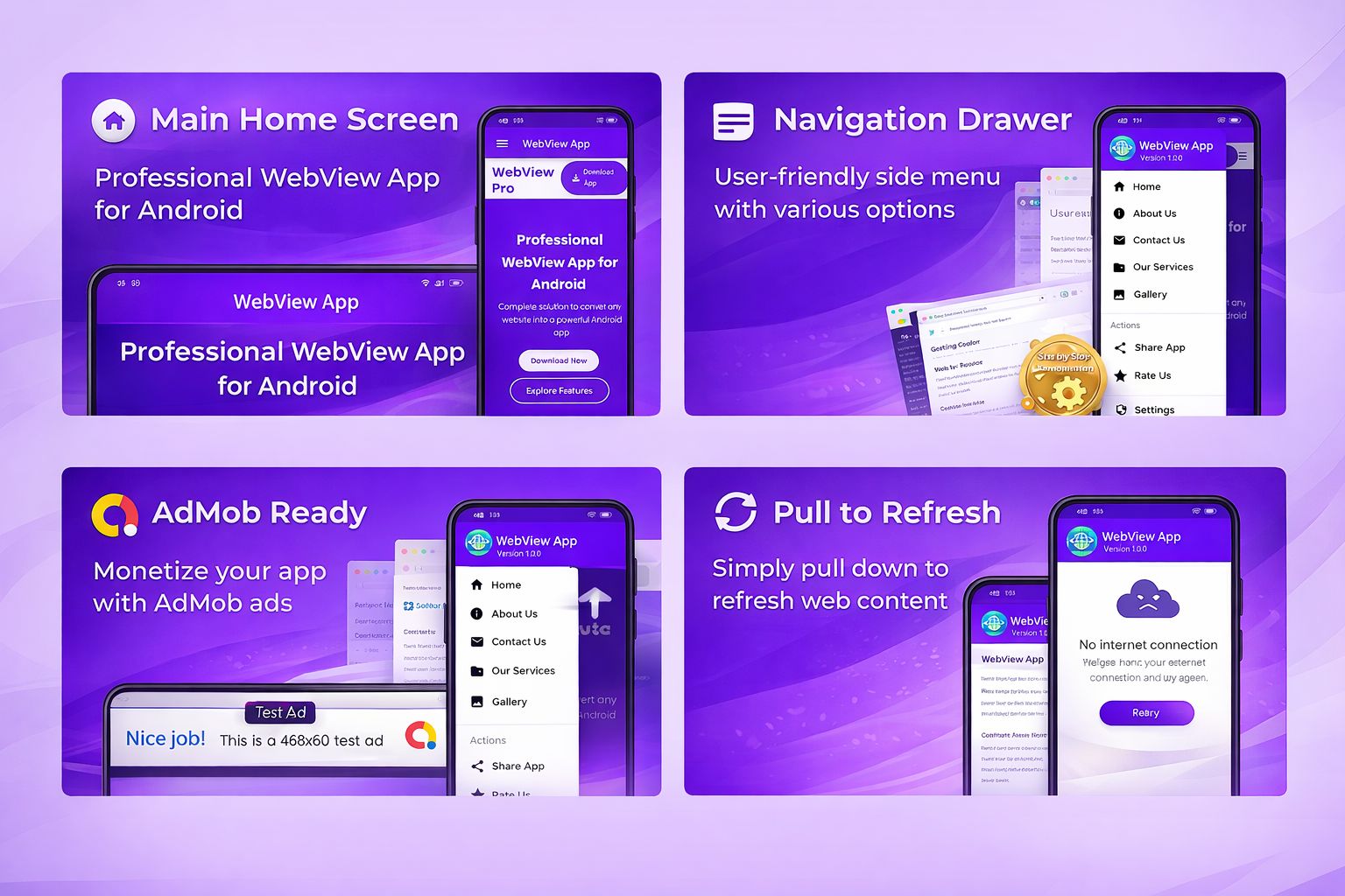 Convert any website to a powerful Android app with Material Design 3, Navigation Drawer, AdMob Ads, File Upload, Pull to Refresh,WebView Pro - Professional Android WebView App