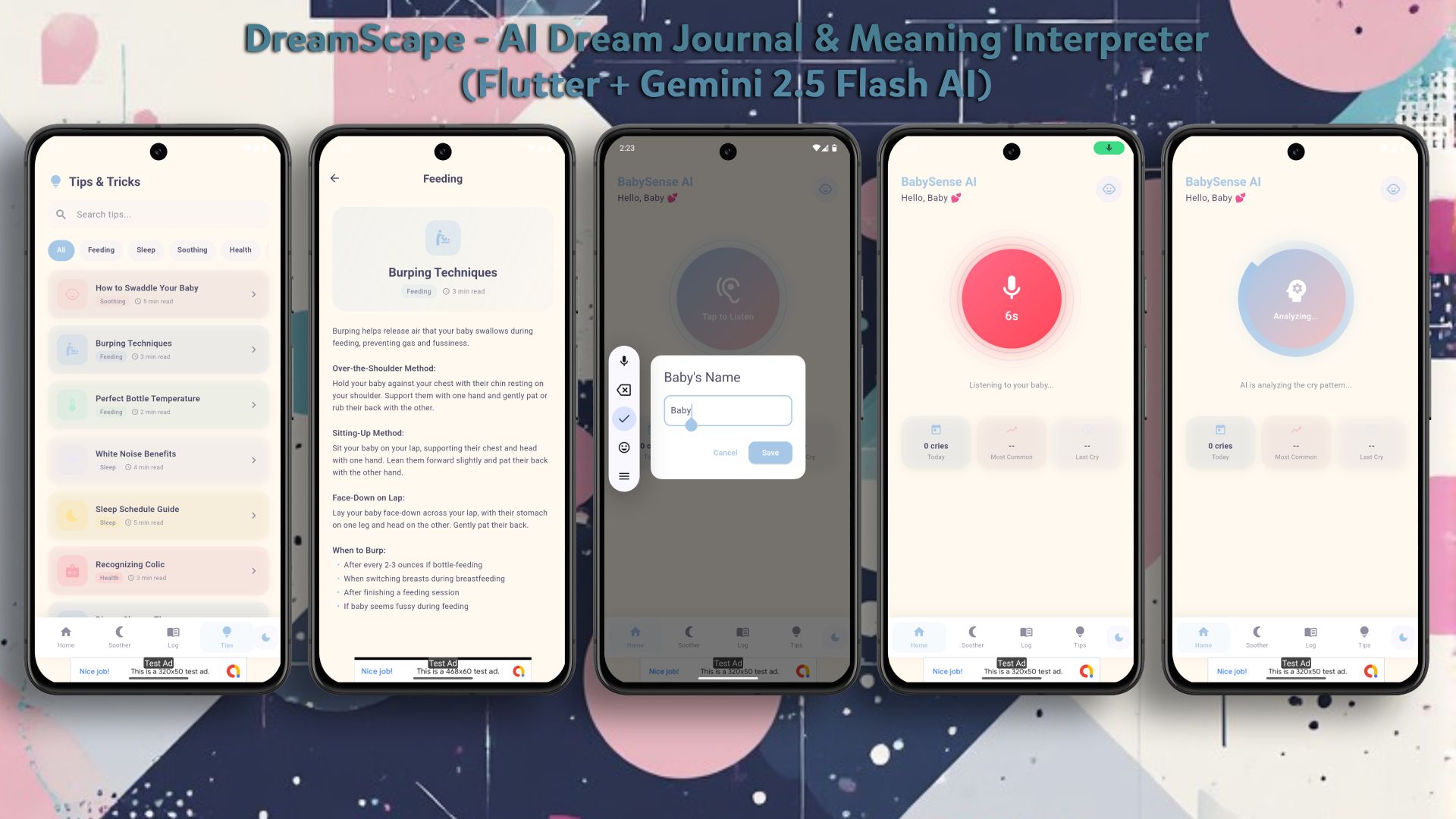 BabySense AI is a professional, high-end Flutter application template designed for developers and entrepreneurs who want to enter the lucrative parenting app market. This application uses cutting-edge Artificial Intelligence (Google Gemini 2.5 Flash) to analyze and classify baby cries, helping parents understand if their baby is hungry, tired, in pain, or experiencing discomfort.
