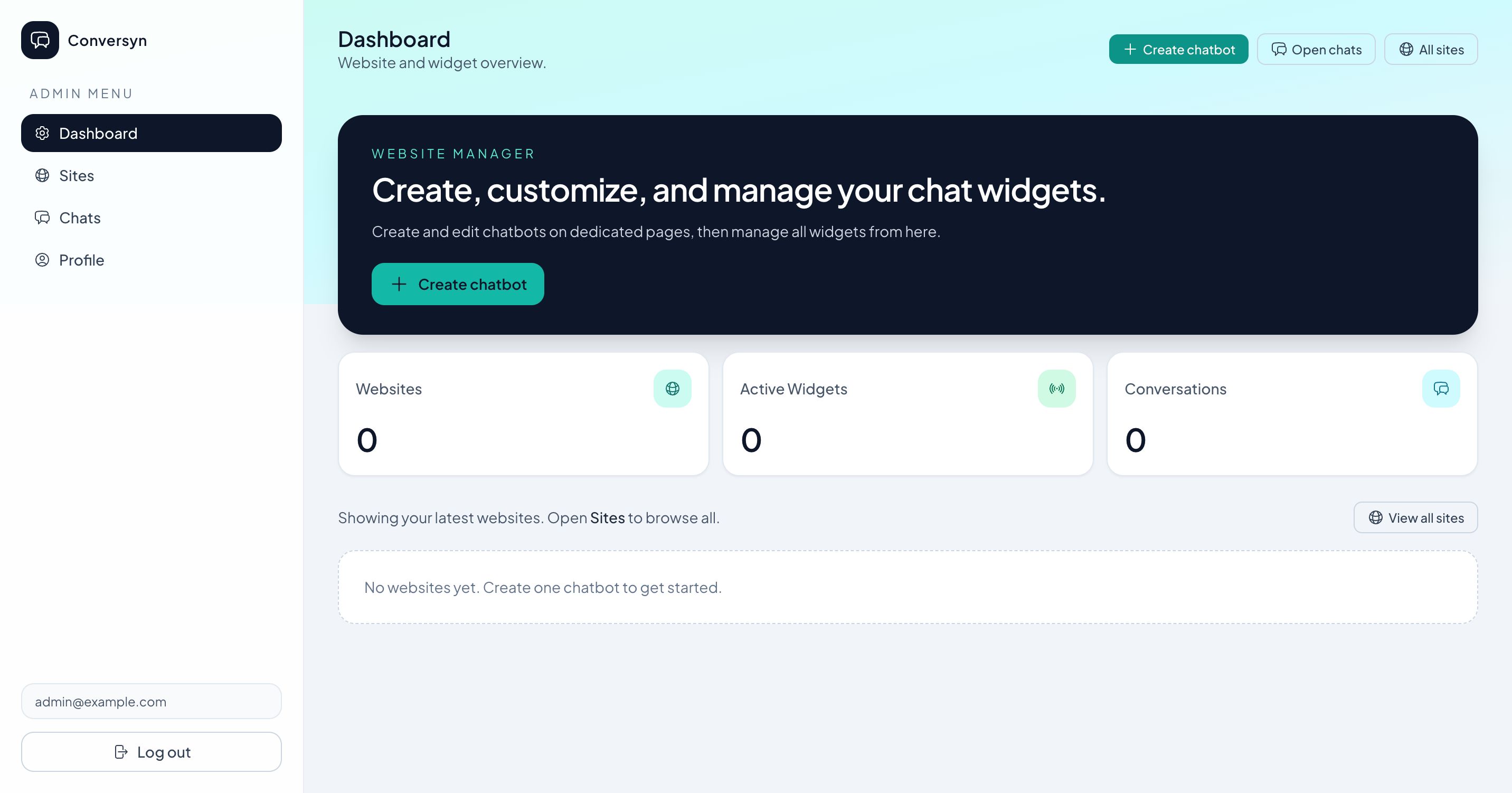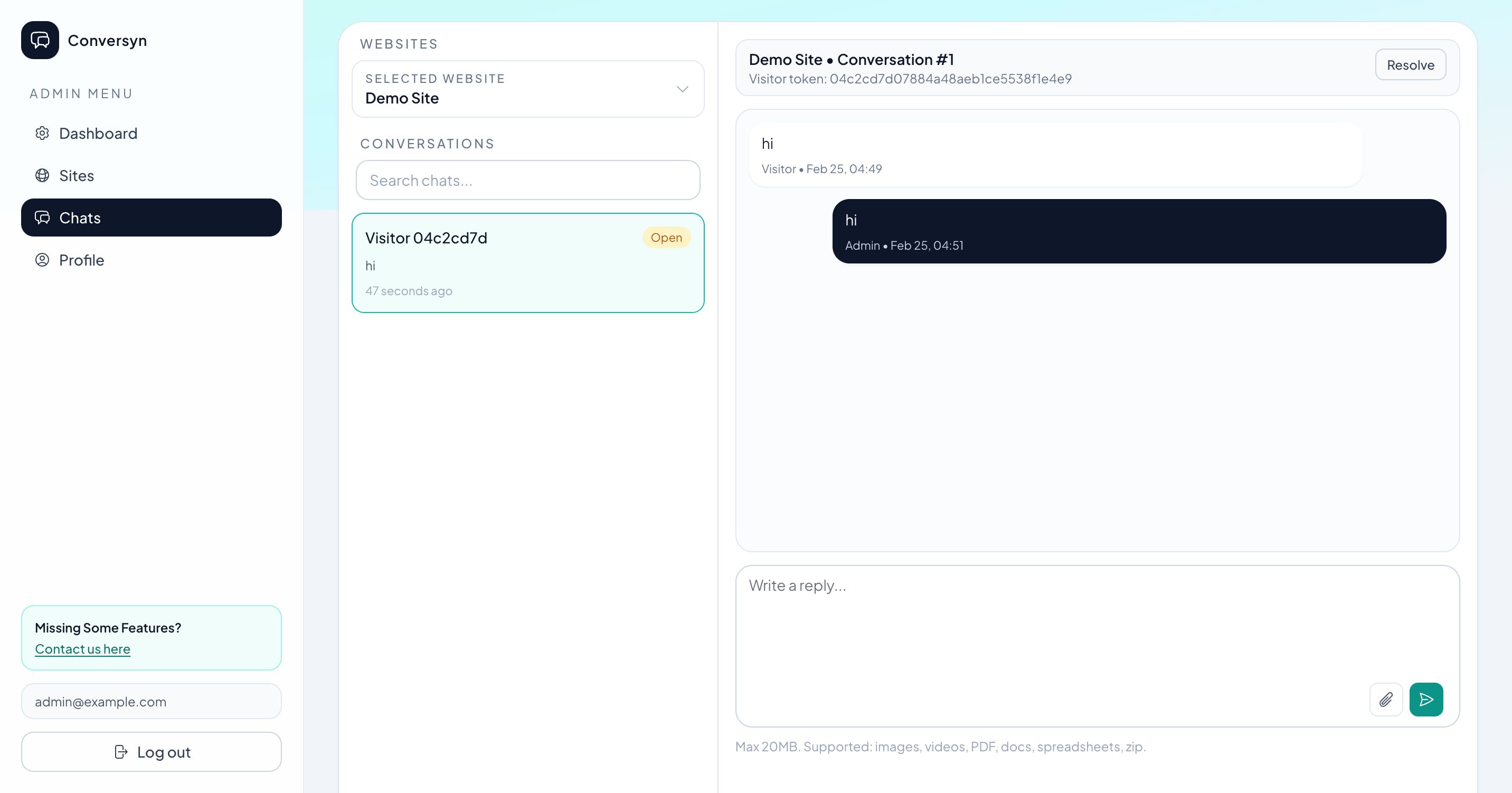 Conversyn is a multi-site live chat platform built with Laravel 12, Livewire 3, and Filament 4. Create a chat widget for each website, embed it with one script tag, and manage all visitor conversations from one inbox.