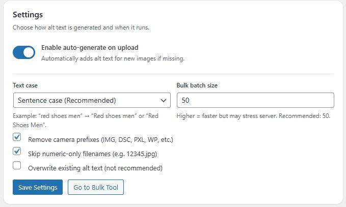 Optimize your entire existing WordPress media library in one click. The bulk processing feature scans all previously uploaded images and generates optimized alt text automatically, saving hours of manual editing.