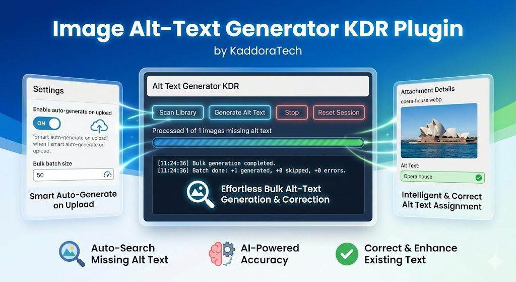 Kaddora AI – Image Alt Text Generator for WordPress is an advanced AI-powered plugin designed to automatically generate intelligent, descriptive, and SEO-optimized alt text for your website images.
