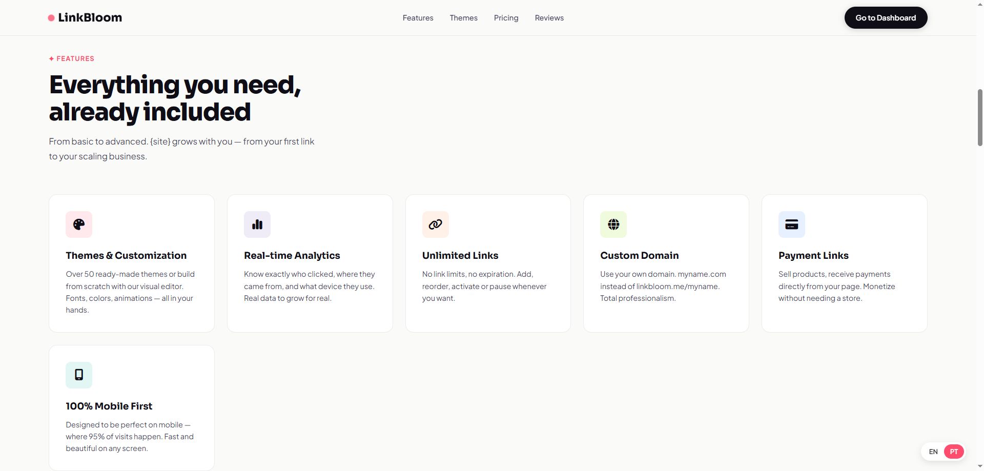 LinkBloom allows users to create beautiful and fully customizable profile pages where they can: