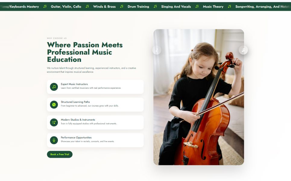 Aegis focuses on what music institutions need most: clear course presentation, easy contact, and attractive media showcases. The template includes dedicated sections for programs, instructors, testimonials, pricing, and FAQs, allowing visitors to understand your academy at a glance and quickly take action.
