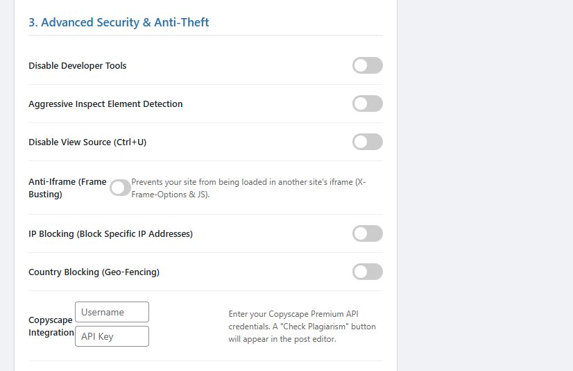 - Activity Logging: Track who is trying to copy your content with real-time logs (IP, Action, Time).