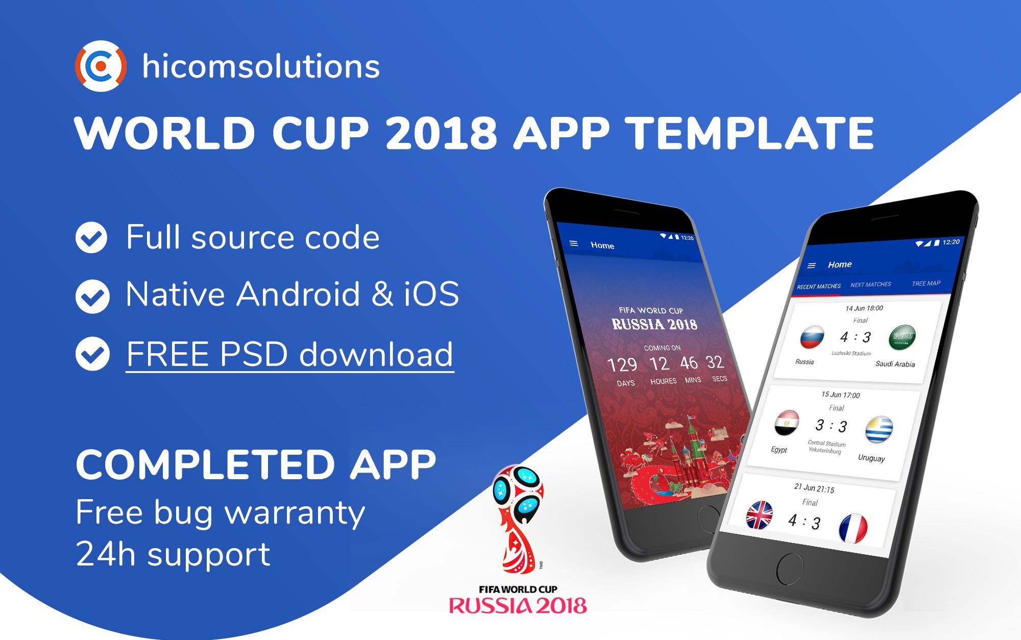World Cup Russia 2018 will kick off soon on Thursday, June 14, 2018 in Russia. This is a huge party for football fans all over the world. Everyone will pay attention to their favorite teams and players. Don’t hesitate to publish this app for this event to attract millions of users and you can earn from your admobs account. This app template, script, source code is built native by Android Studio, the live scores will be updated automatically thanks to the feeds from xmlsoccer.com. The user will be notified after each goal. We receive any reskin, translation, setup or custom app development request from you. We are available to fix bugs FREE during the World Cup.