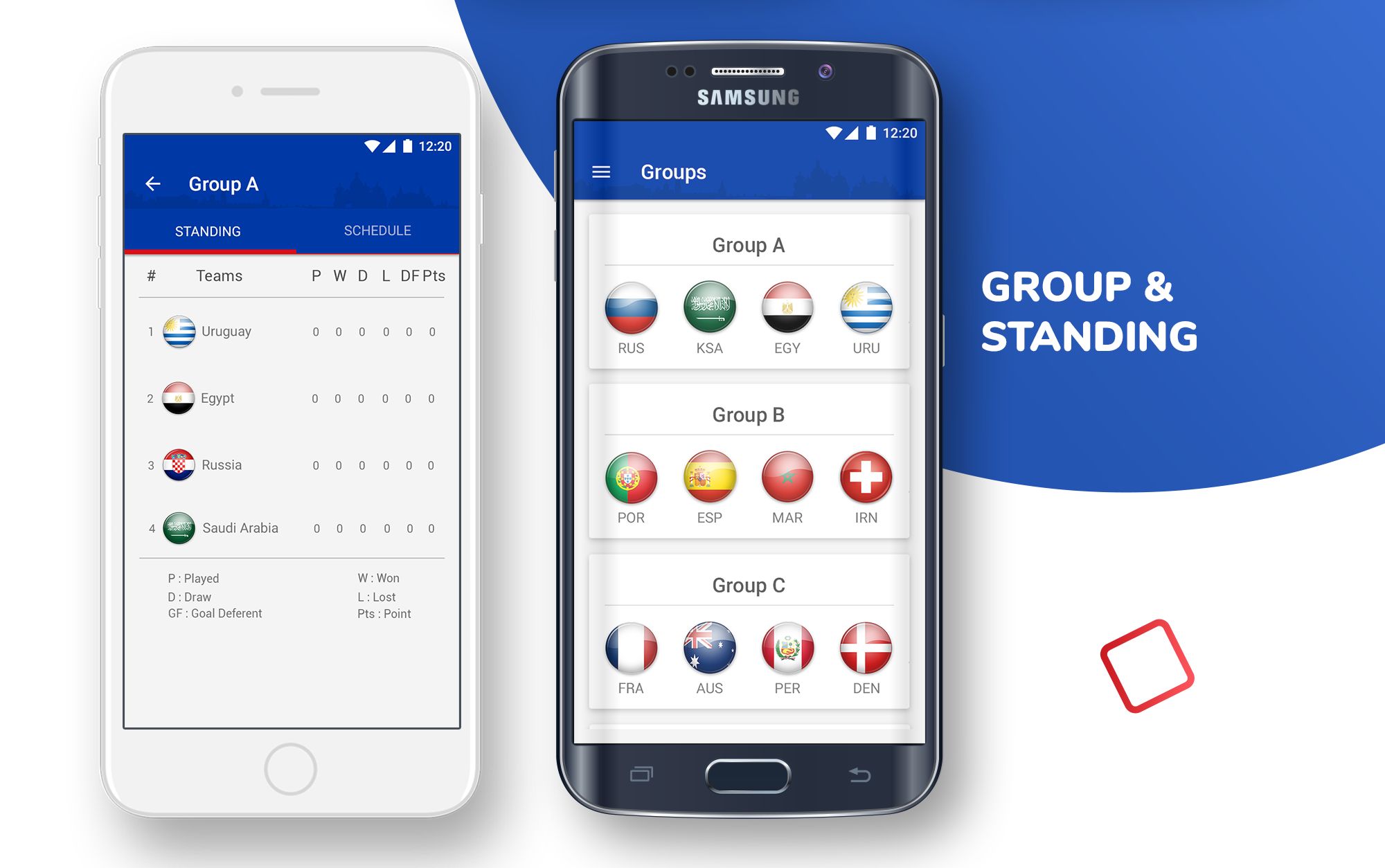 - Standing: user can see teams’ current position, scores, win, lose, draw per group