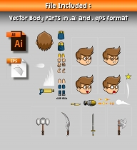 Ai and Eps File is just contains Vector Body Parts only, and there is no AI or PS for character sprites It’s because Animation is done in BRASHMONKEY SPRITER!. But there is a high resolution PNG images for every Animation sprites