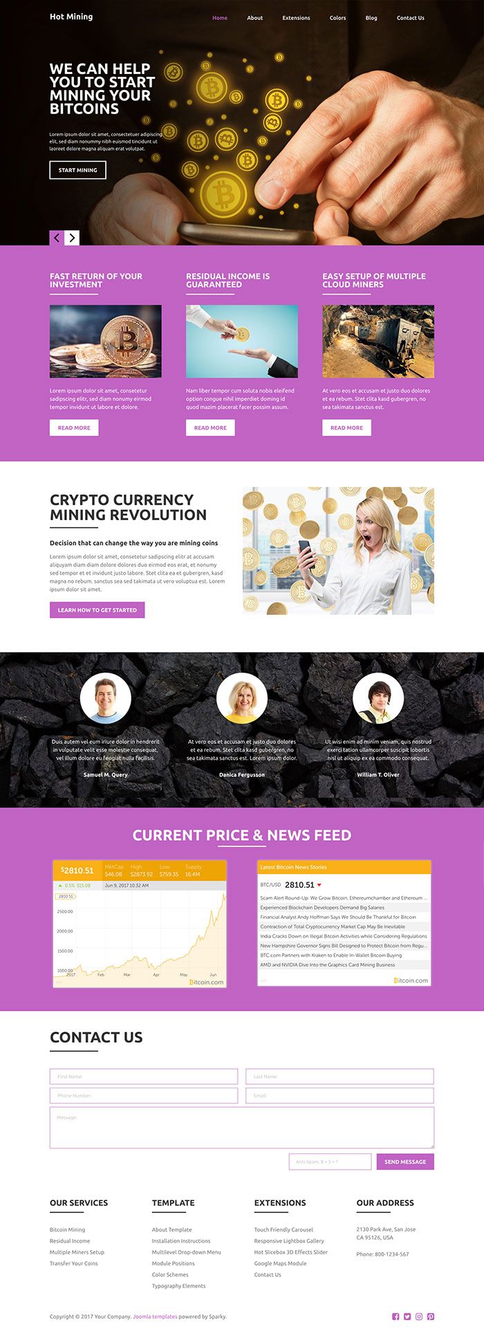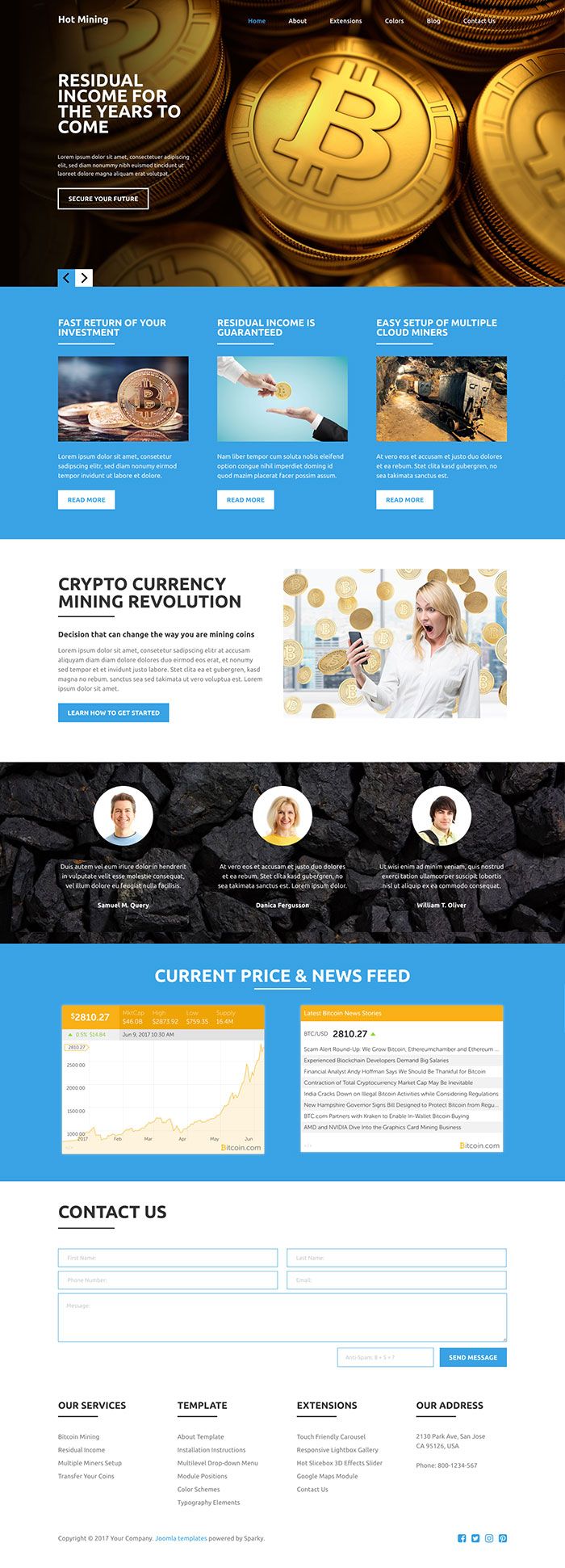 The Hot Mining Joomla template includes 3 widgets that fetch data directly of the official Bitcoin's website. Visitors of your site will be able to see the price of this crypto currency live. They would be also able to analyze its price over time from the live graphics. There's also a widget that fetches links of the latest news from the world of Bitcoins.