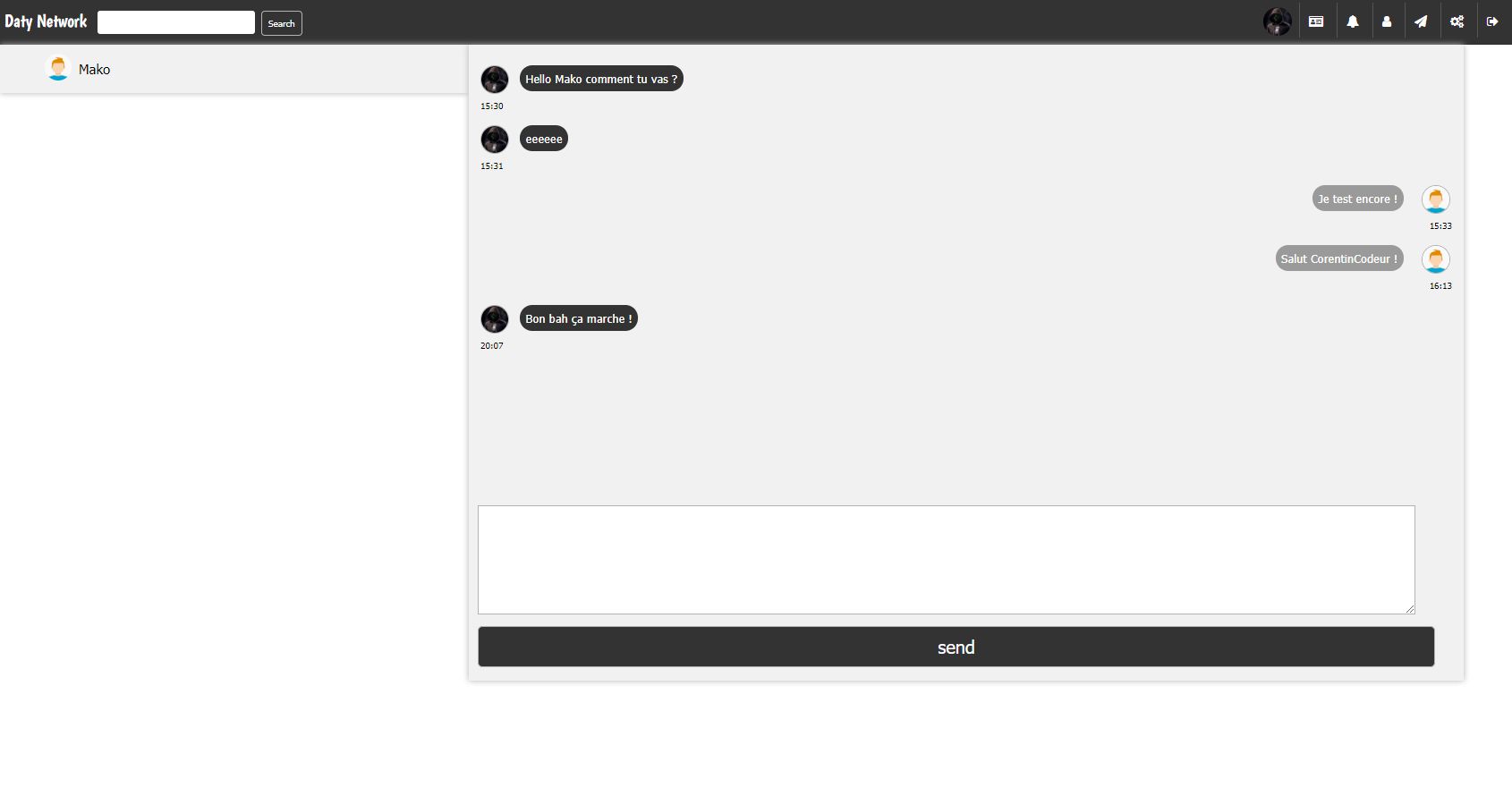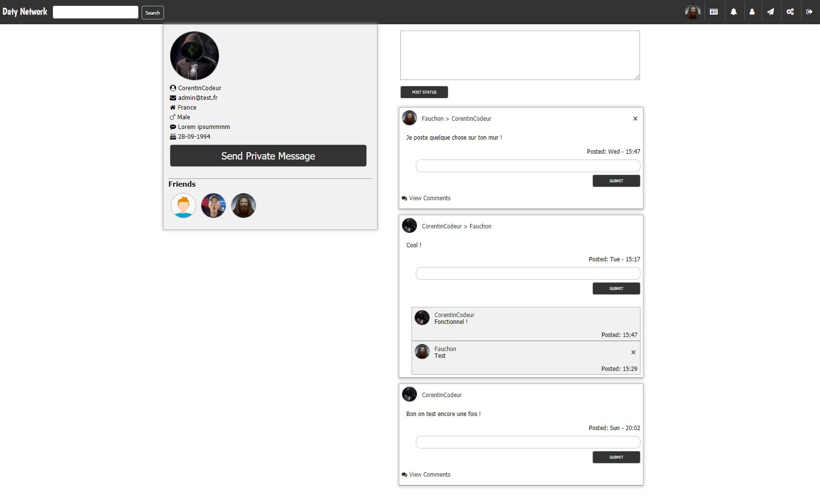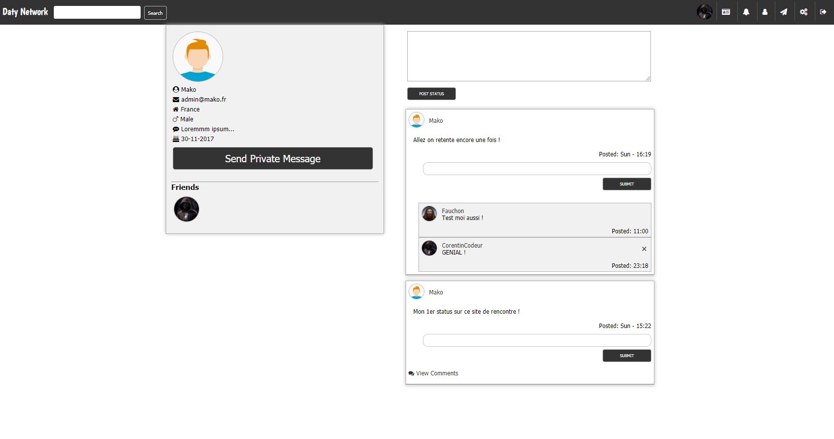 Daty is a social network that includes commentary space as well as instant messaging and add friend function. All this coded in php / mysql / jquery / Ajax