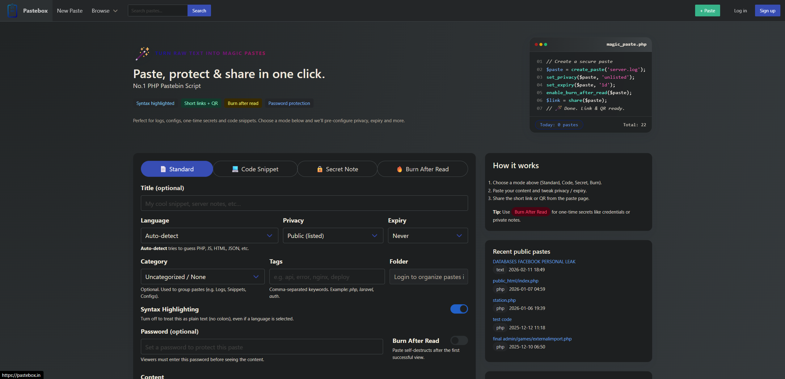 | Tags | pastebin, php mysql script, php paste script, php pastebin clone, code sharing script, text sharing script, snippet manager, code snippet tool, secure pastebin, encrypted notes script, burn after read script, syntax highlighting script, secret notes script, anonymous paste script, paste sharing platform |